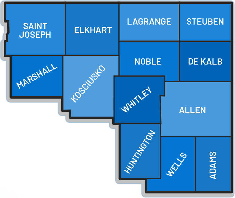 Fort Wayne, Elkhart, Goshen, New Haven, Columbia city, Warsaw, Huntington, South Bend, La Grange, Auburn, and Surrounding areas.